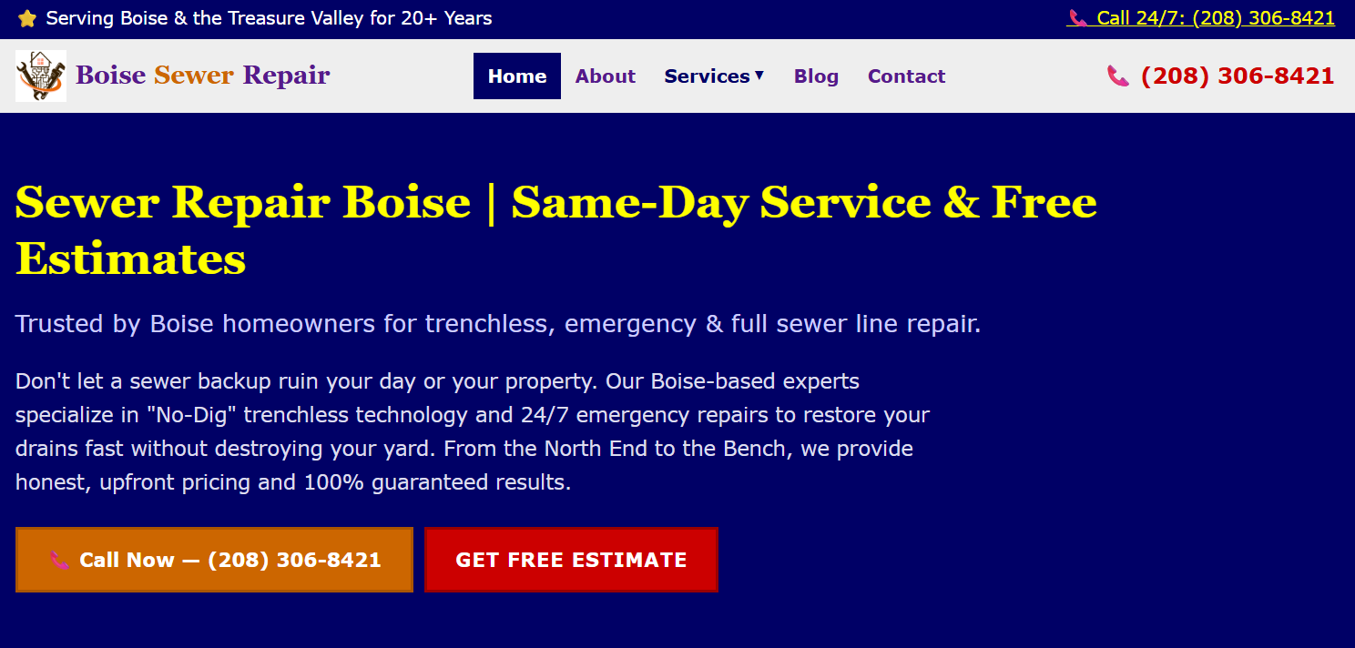 Boise Sewer Repair is a locally owned and operated sewer repair company serving homeowners and businesses across the Treasure Valley. With over 20 years of hands-on experience, we specialize in sewer line repair and replacement, drain cleaning, hydro jetting, trenchless sewer repair, and video camera inspection. We provide fast, reliable, and affordable sewer solutions for both residential and commercial clients throughout the Boise, Idaho area. Available 24/7 for emergency services. Call us today at (208) 306-8421.
